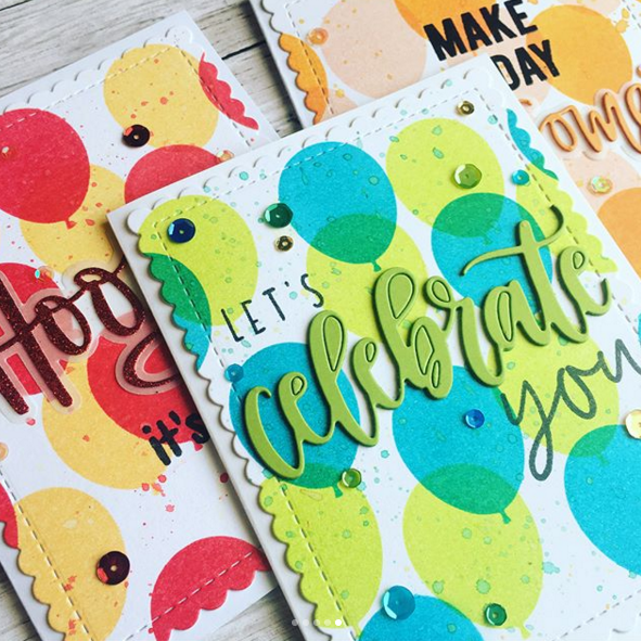 Neat and Tangled came out with a small birthday balloon stencil which is what I used here to create a fun and colorful background for each card.